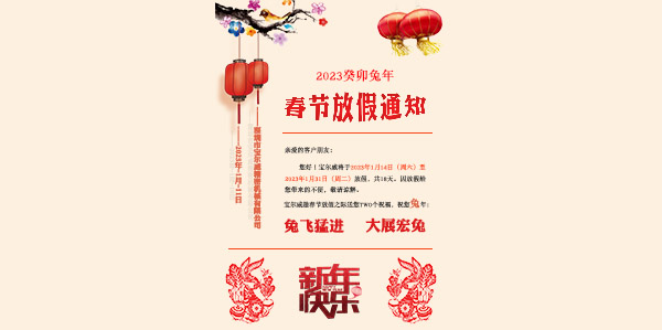 您好!寶爾威將于2023年1月14日(周六)至2023年1月31日(周二)放假,共18天。因放假給您帶來(lái)的不便,敬請(qǐng)諒解。