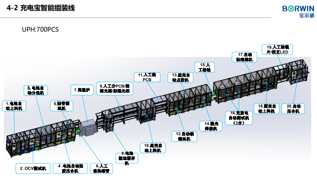 充電寶生產線項目案例部位功能: 1、電池自動上料機; 2、OCV測試機; 3、電池自動分選機; 4、電池自動貼膠壓合機; 5、貼紙機; 6、人工上熱縮管;